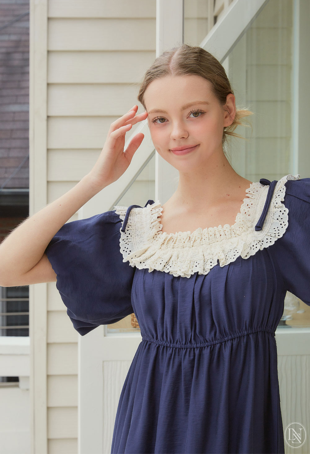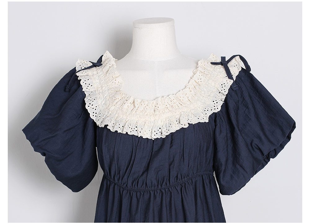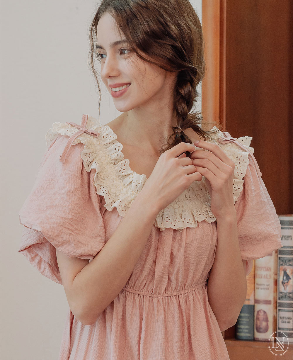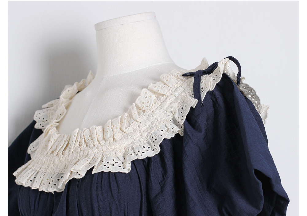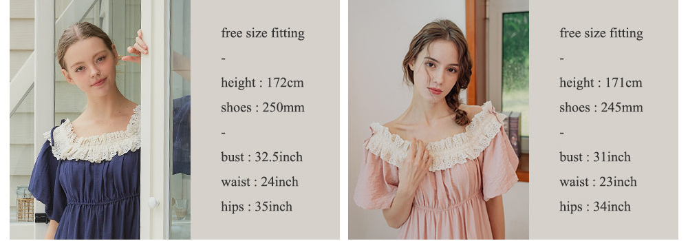 네크라인 전체에 밴딩이 내장 되어있어 탈착용이 편하며, 오프숄더로도 연출할 수 있는 디자인이에요. 어디에서도 보지 못했던 자체 디자인한 프리미엄 레이스 디테일이 포인트며 로맨틱한 무드를 더해준답니다. 소매는 2중으로 원단을 잡아 볼륨감이 더욱 살아나는 벌룬 소매 형태로 아방하고 편안한 핏감이에요. 어깨에 리본을 달아주어 사랑스러운 분위기가 느껴져요. 100% 국내 제작으로 소재, 디자인, 봉제의 퀄리티가 높습니다.
