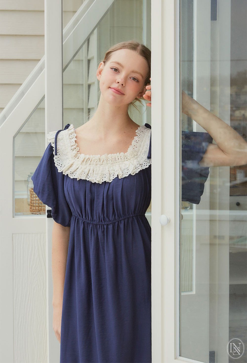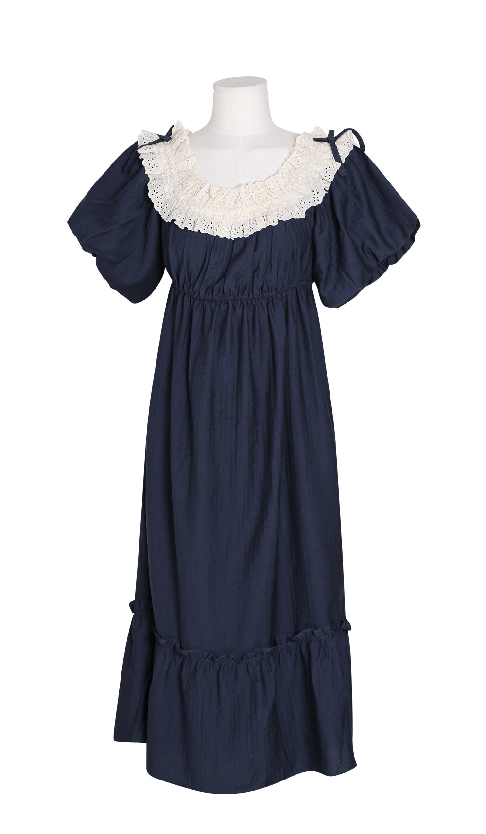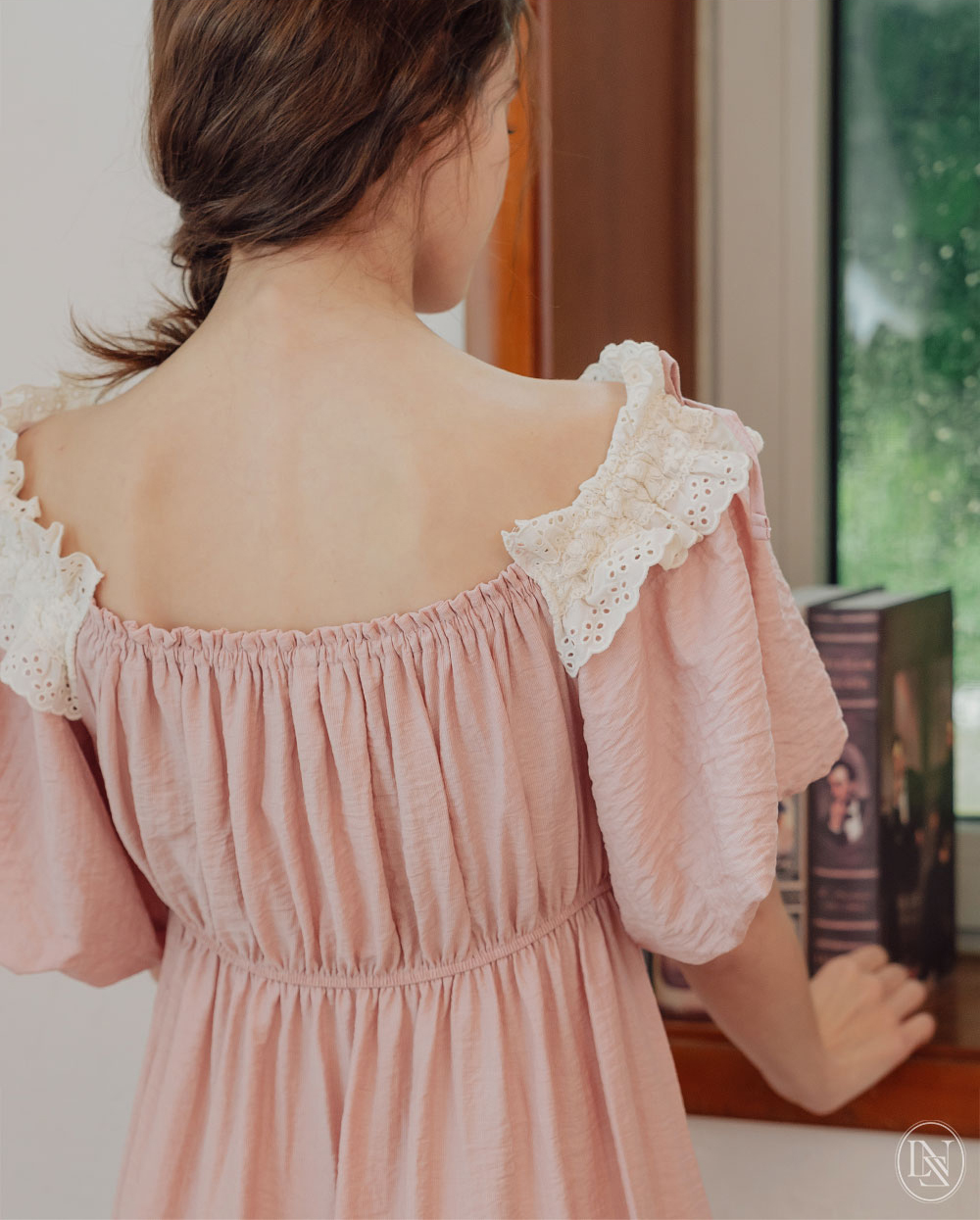 네크라인 전체에 밴딩이 내장 되어있어 탈착용이 편하며, 오프숄더로도 연출할 수 있는 디자인이에요. 어디에서도 보지 못했던 자체 디자인한 프리미엄 레이스 디테일이 포인트며 로맨틱한 무드를 더해준답니다. 소매는 2중으로 원단을 잡아 볼륨감이 더욱 살아나는 벌룬 소매 형태로 아방하고 편안한 핏감이에요. 어깨에 리본을 달아주어 사랑스러운 분위기가 느껴져요. 100% 국내 제작으로 소재, 디자인, 봉제의 퀄리티가 높습니다.