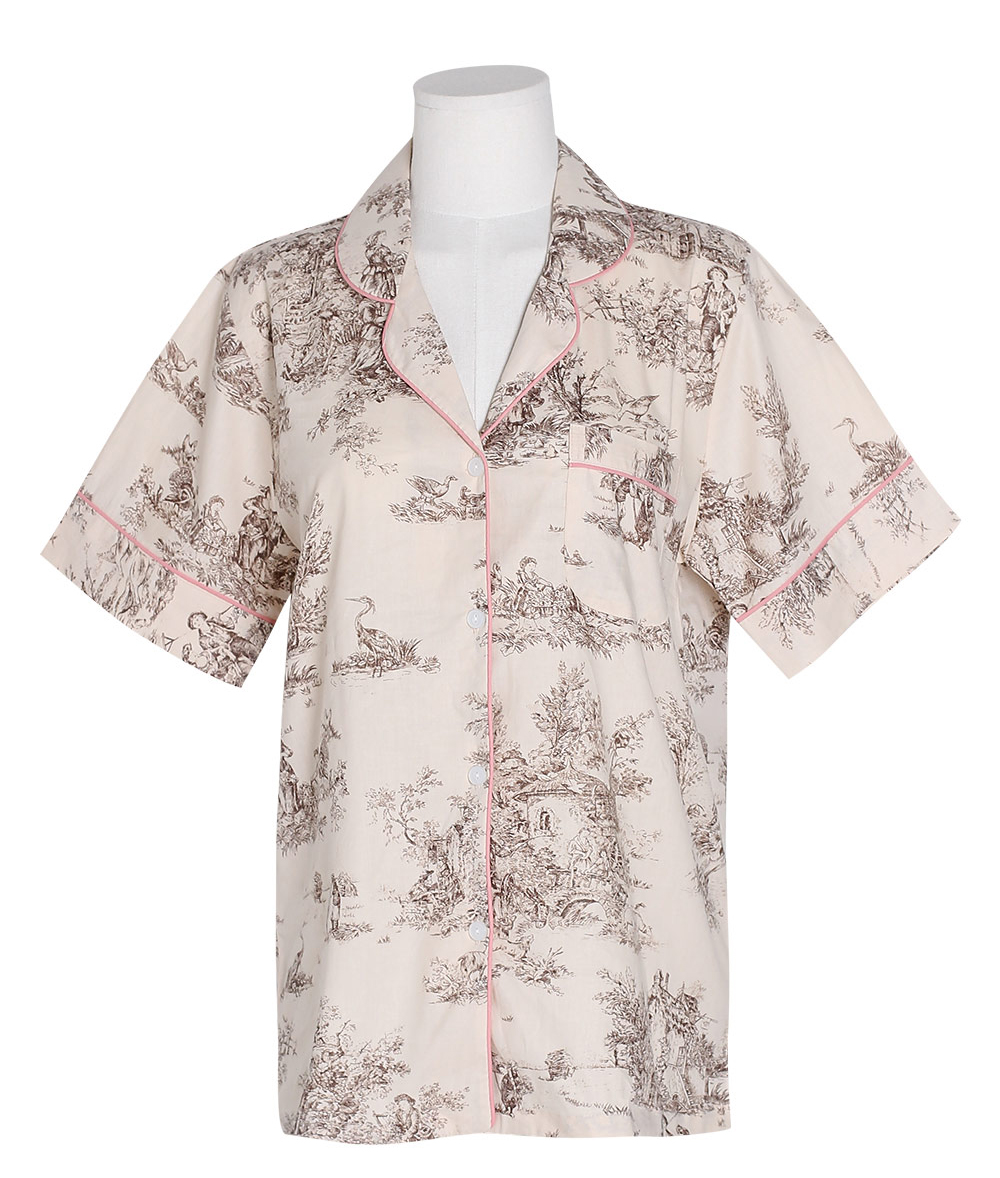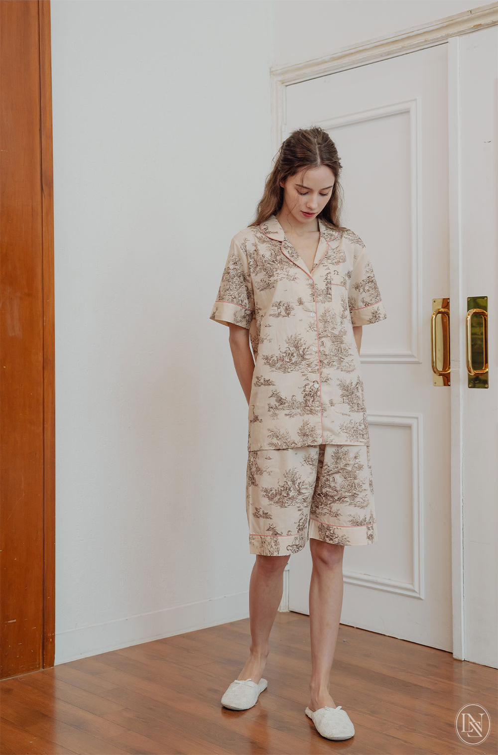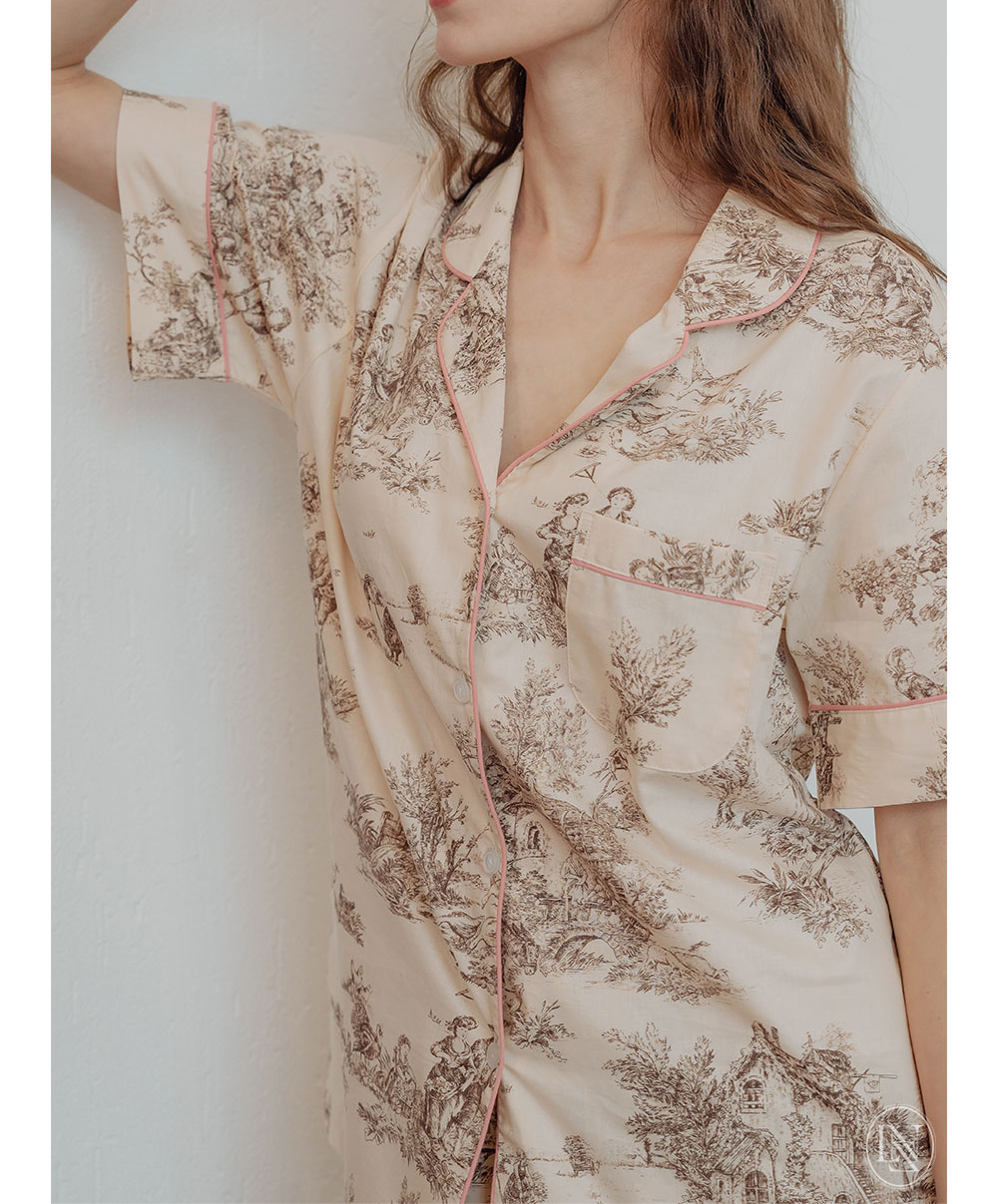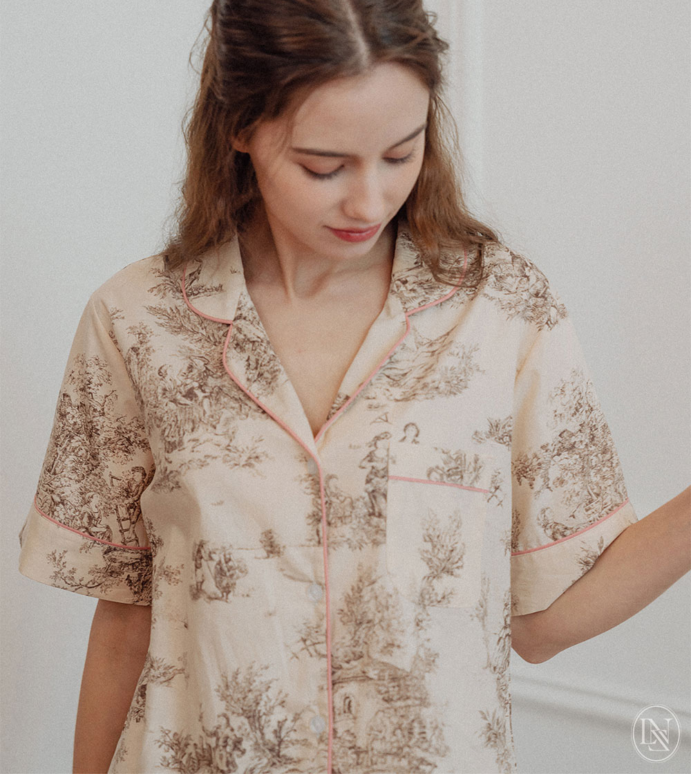 트왈드주이 패턴으로 장식된 시원한 코튼 원단이에요. 프랑스의 시골풍경, 동물, 식물 등이 세련되게 표현된 트왈드주이 패턴을 프린팅한 디자인입니다. 상쾌함이 느껴지는 가벼운 소재로 S/S 시즌에 시원하게 입으실 수 있는 잠옷이에요. 차분한 베이스 컬러에 상큼한 무드의 컬러 파이핑으로 포인트를 주어 밋밋하지 않고 코지한 무드가 한껏 느껴져요.