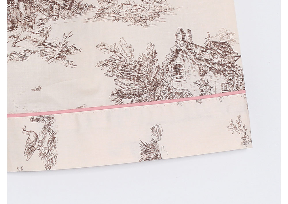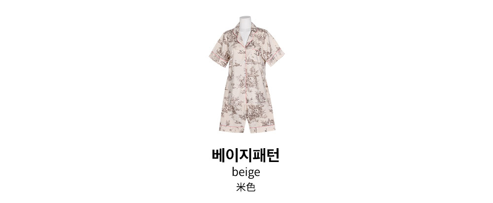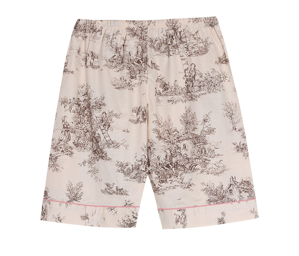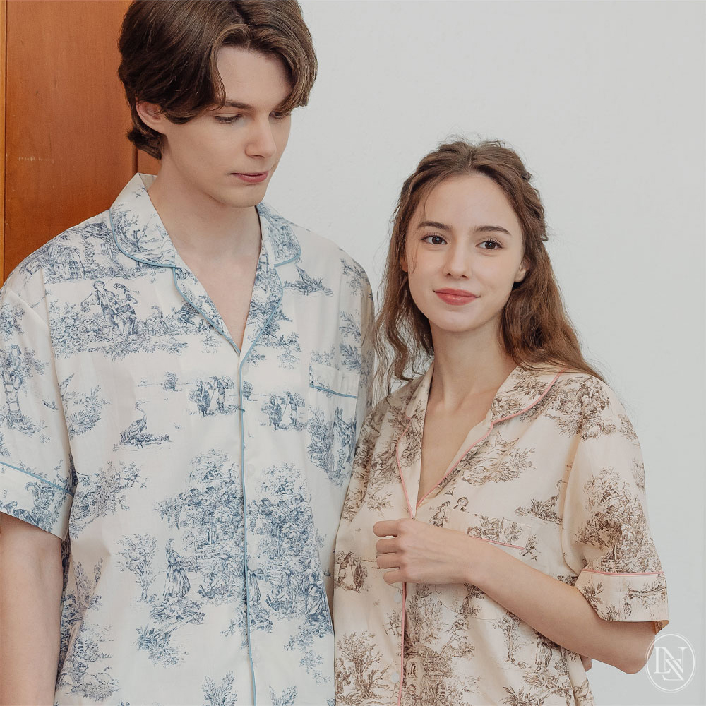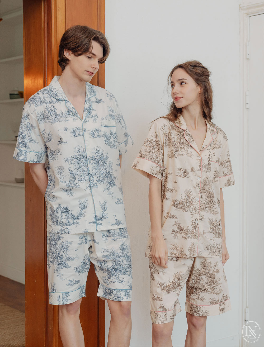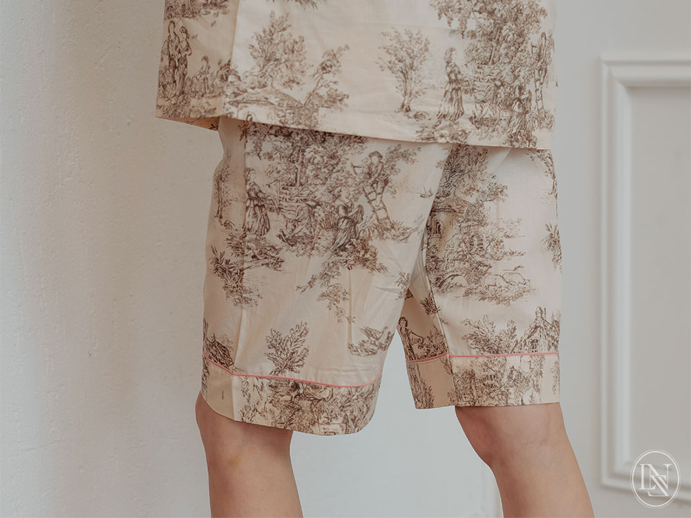 트왈드주이 패턴으로 장식된 시원한 코튼 원단이에요. 프랑스의 시골풍경, 동물, 식물 등이 세련되게 표현된 트왈드주이 패턴을 프린팅한 디자인입니다. 상쾌함이 느껴지는 가벼운 소재로 S/S 시즌에 시원하게 입으실 수 있는 잠옷이에요. 차분한 베이스 컬러에 상큼한 무드의 컬러 파이핑으로 포인트를 주어 밋밋하지 않고 코지한 무드가 한껏 느껴져요.