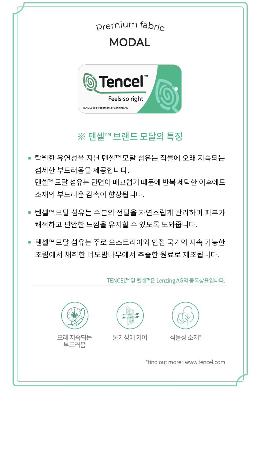 흡습성이 좋은 면과 소프트한 터치감의 모달 혼방 소재로